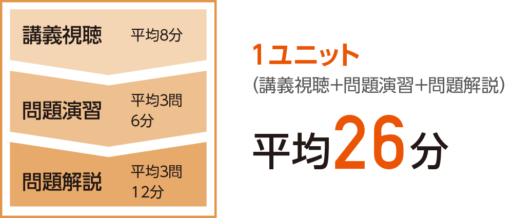 スモールユニット方式®は、講義をトピックごとに細分化しているので、その項目について他の項目と知識を混同せず、理解を定着させることができます。また、1ユニット平均26分で完結するので、スキマ時間を使った学習も可能となります。タブレットやスマートフォンにも対応しているので、移動時間を活用した学習も可能です。Zoomライブ配信講義とeラーニング講義の内容は同じです。