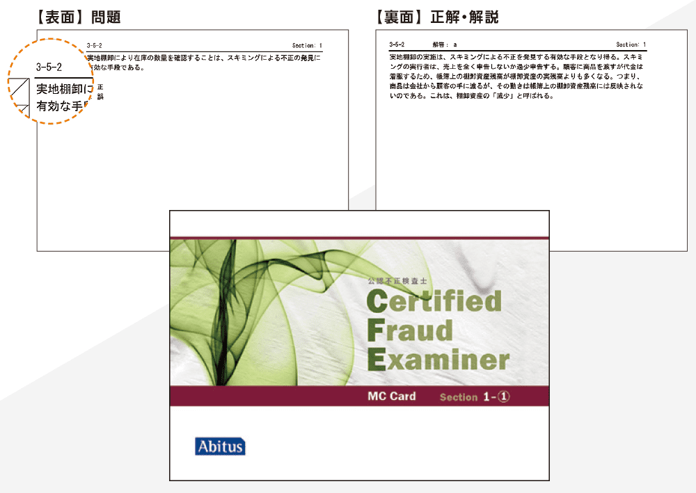 CFE試験は全て4択または2択の選択問題(Multiple Choice : MC)で構成されています。A6サイズのカード式問題集は持ち運びに便利で、通勤時間などのスキマ時間も活用して演習できます。問題番号は、テキストの該当ユニットと紐付いており、テキストの説明をすぐに確認できます。