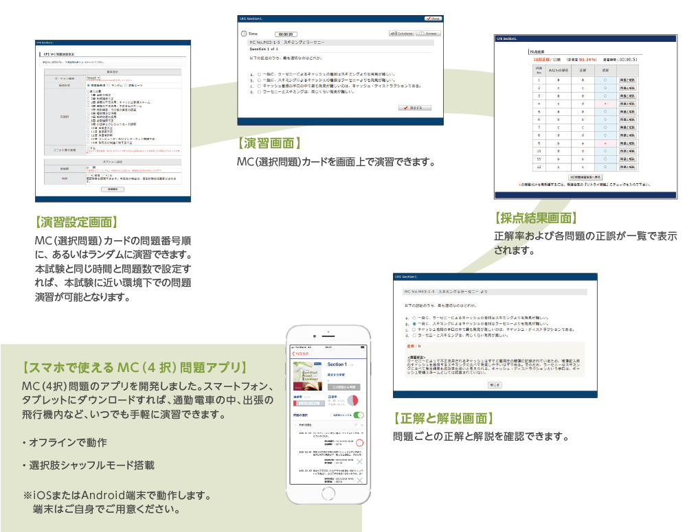 MC問題はWeb上でも演習できます。章ごとでの演習、間違えた問題のみの演習、ユニットごとの演習、さらにはランダムに抽出しての演習ができますので、学習進捗に合わせた実践的な問題演習ツールとしてご利用いただけます。