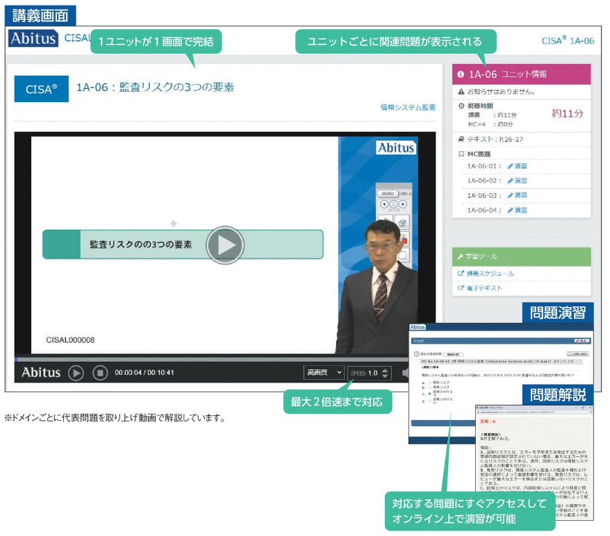 アビタスCISA®プログラムの特長は、質の高い講義と教材、サポートです。CISA®に精通した講師陣が講義を担当し、要点を解説します。オリジナルテキストは豊富な図解で128の論点を効率良くマスターできるよう構成しています。問題演習コンテンツも豊富にご用意しており、最短5カ月、250時間での合格を可能にします。受験手続きサポートをはじめ、学習に専念していただけるサポートも万全です。