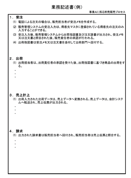業務記述書は、企業の財務報告における業務内容や手順などを明文化した書類です。