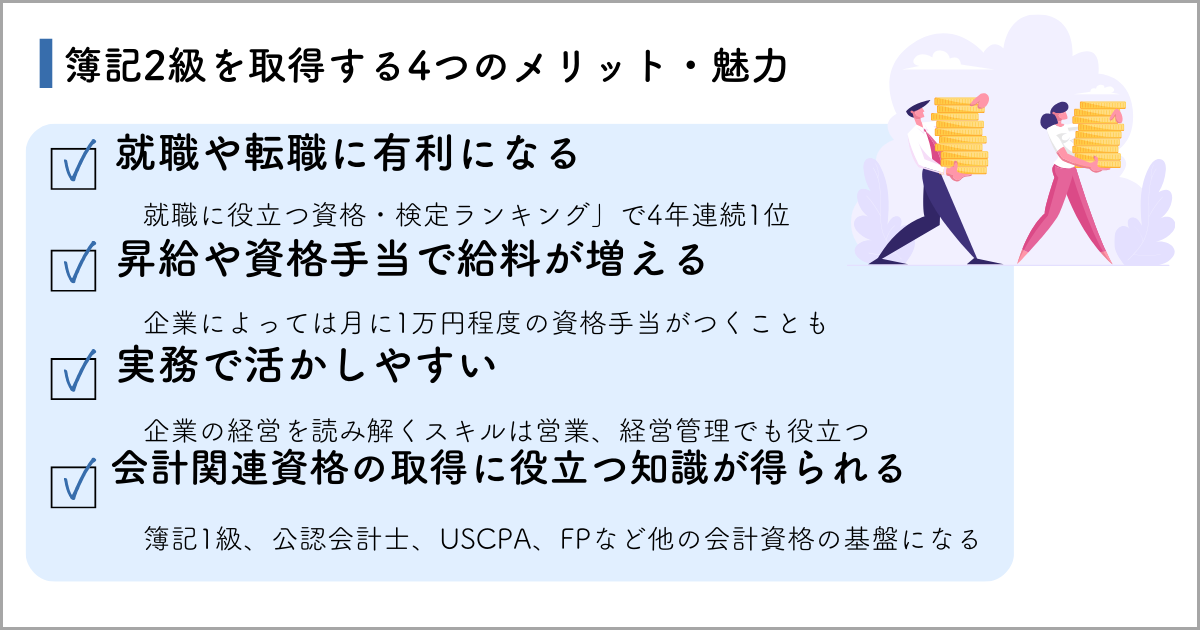 ここでは、簿記2級を取得するメリットや魅力を4つ見ていきましょう。