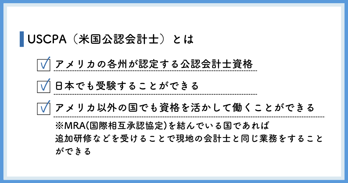 USCPAはアメリカの各州が認定する公認会計士資格です。アメリカの資格ではありますが、日本でも受験可能です。