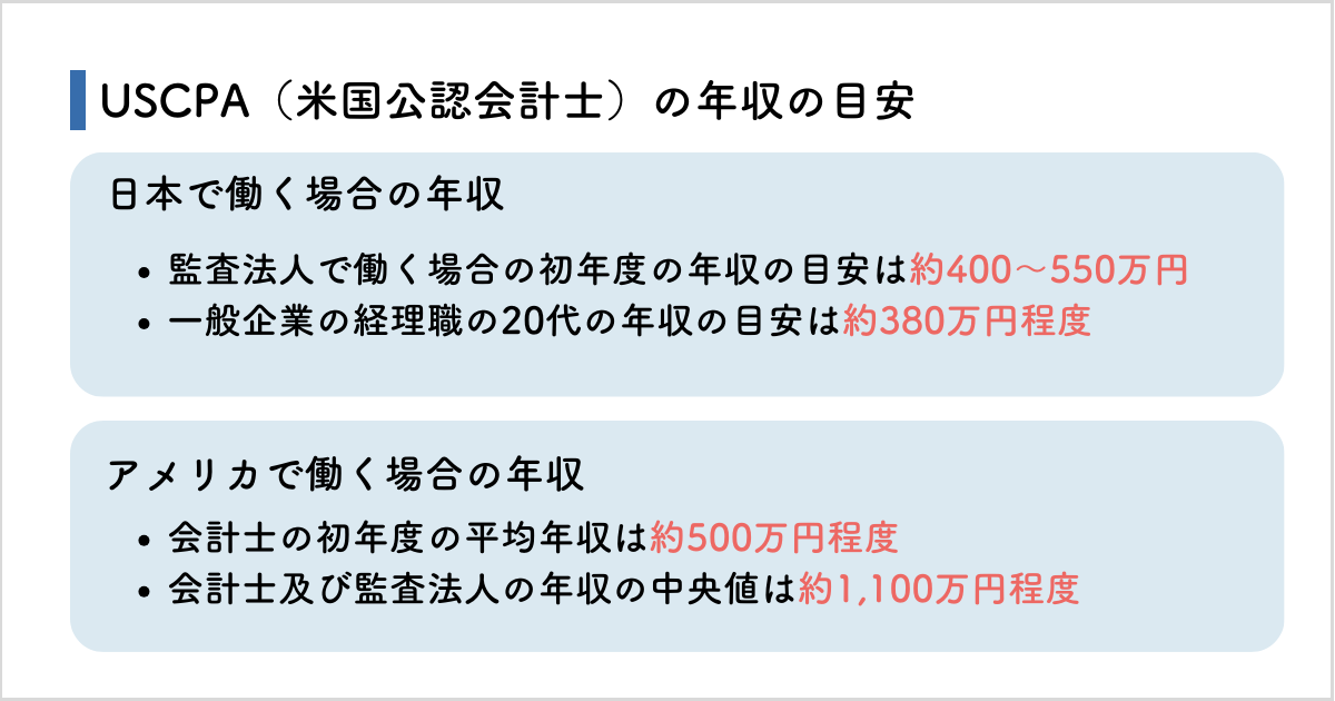 USCPAのアメリカでの初年度平均年収は約500万円です。その後は、勤続年数によって変わっていきます。