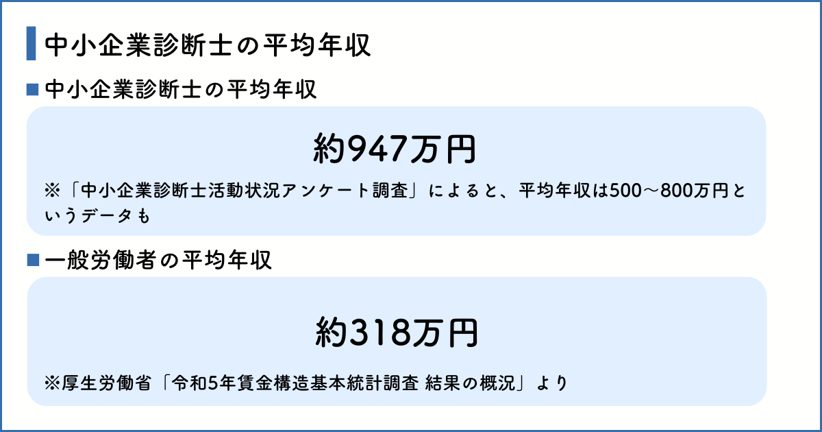 国内の一般労働者の平均年収は約318万円であるため、中小企業診断士の年収は約3倍高くなります。