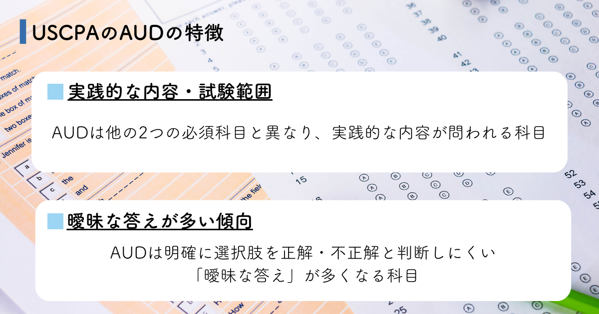 AUDは明確に選択肢を正解・不正解と判断しにくい「曖昧な答え」が多くなる科目です。