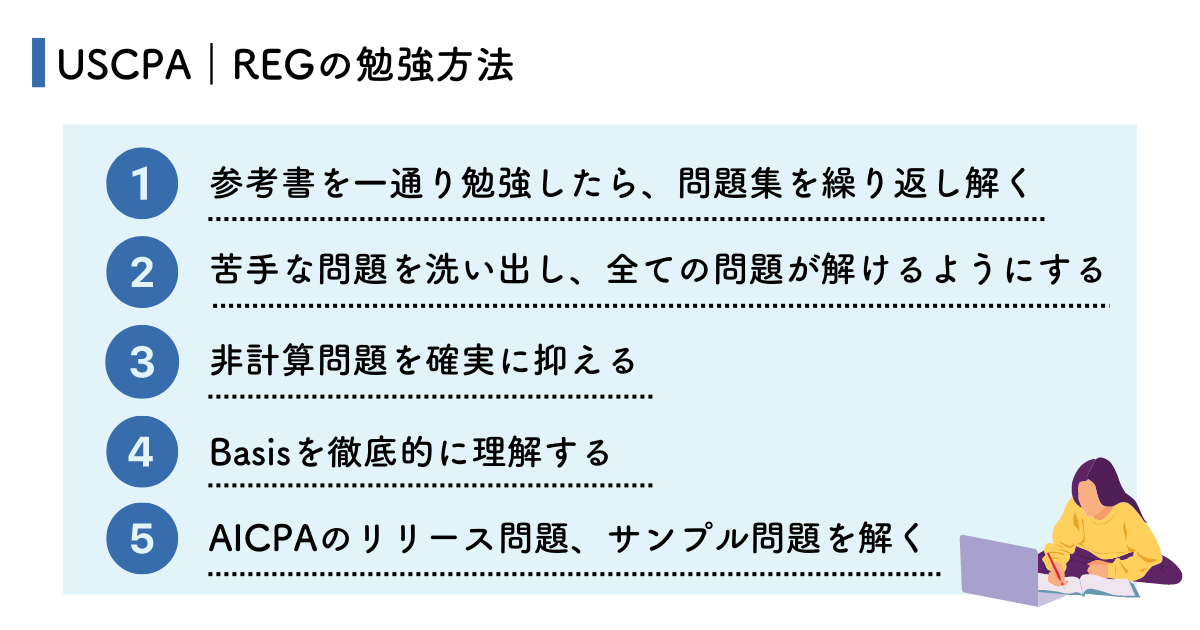 REGは暗記することが多い科目で、USCPAの科目の中でも難易度は低めと予想されます。
