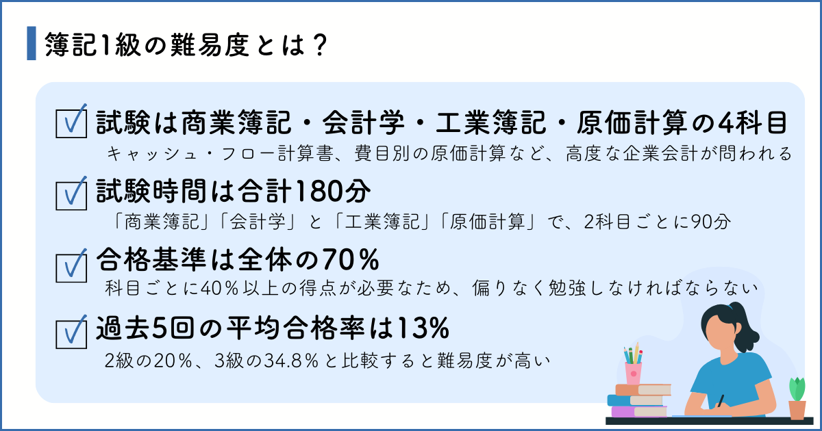2級・3級と比較した場合、簿記1級は科目数が多いぶん試験時間も長く、合格率は低いことが分かります。