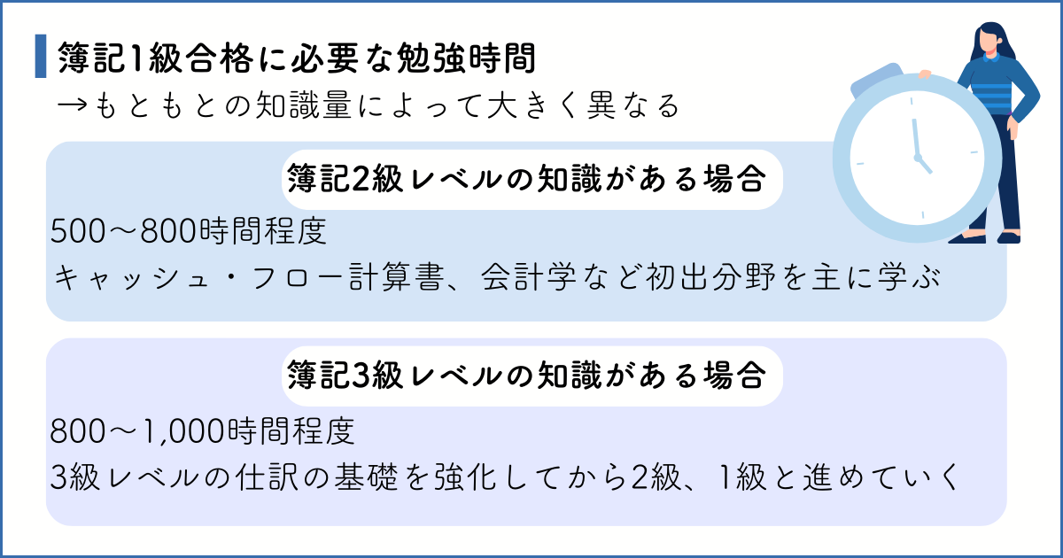 簿記3級程度の会計知識がある場合、必要な学習時間は800〜1,000時間程度と考えられます。