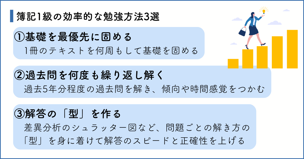 簿記1級は範囲が広く難易度が高いため、できるだけ効率的に勉強を進めたい人も多いでしょう。ここでは、簿記1級の効率的な勉強方法を3つ紹介します。