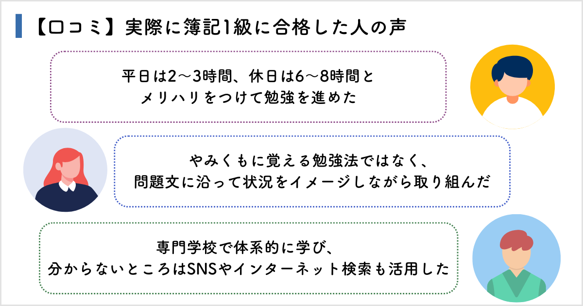 実際に簿記1級に合格した人に対して、アンケート調査を実施しました。