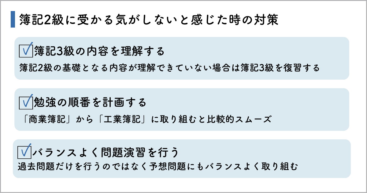 簿記2級に受かる気がしないと感じた場合、どのような対策を取ればよいのでしょうか。