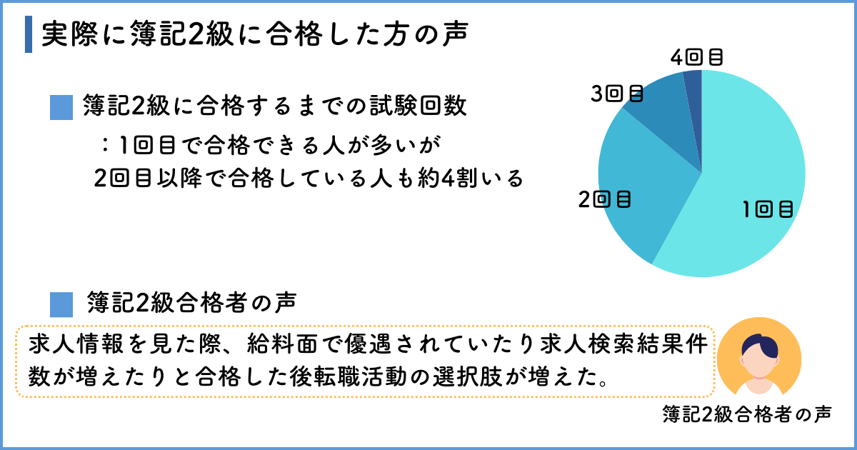 簿記2級の合格者に「何回目の試験で合格したか」を質問したところ、下記の結果となりました。
