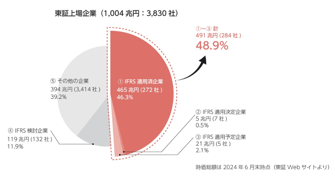 東証上場企業でIFRS適用済会社・IFRS適用決定会社・IFRS適用予定会社の時価総額は東証上場会社の時価総額に占める割合は48.9%です(東証、会計基準の選択に関する基本的な考え方の開示内容の分析より)。