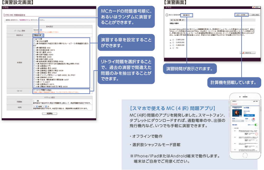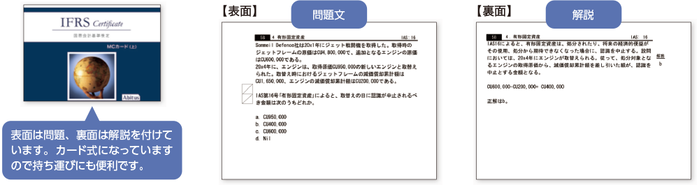 MCカードは、表面に問題1問、裏面にその解答・解説を記載。コンパクトで持ち運びに便利です。電車の中や、 ちょっとした休憩時間なども有効利用できます。また、問題上部には関連するIFRSの基準番号も併記しており、基準の円滑な理解を可能にします。