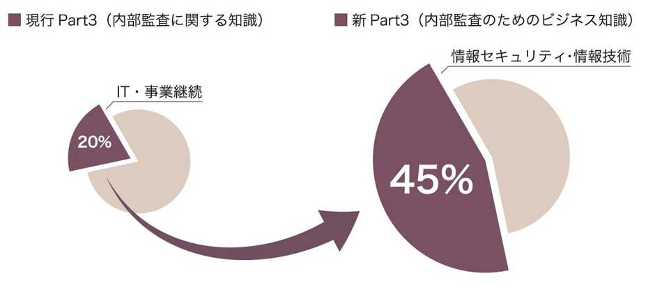 IT (情報セキュリティ・情報技術)の分野が20~25%だったものが45%に拡大されます。サイバーセキュリティのリスクや最新のテクノロジーの実態といった追加トピックも登場します。