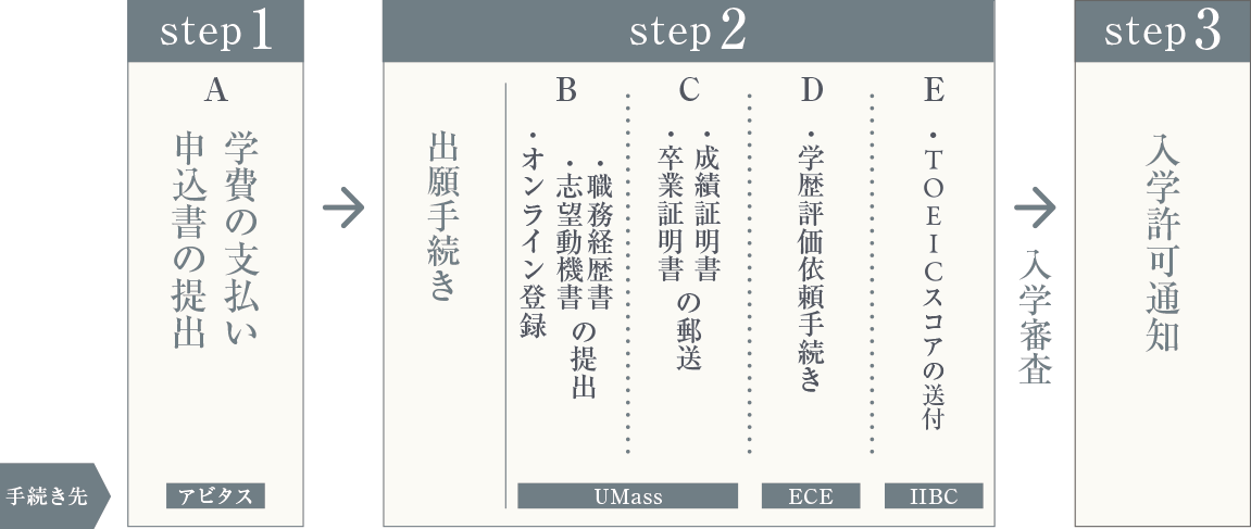入学資格(下記の2つの条件どちらも)を満たしているかをご確認の上、入学希望者はアビタスまで「マサチューセッツ州立大学MBAプログラム申込書」をご提出ください。