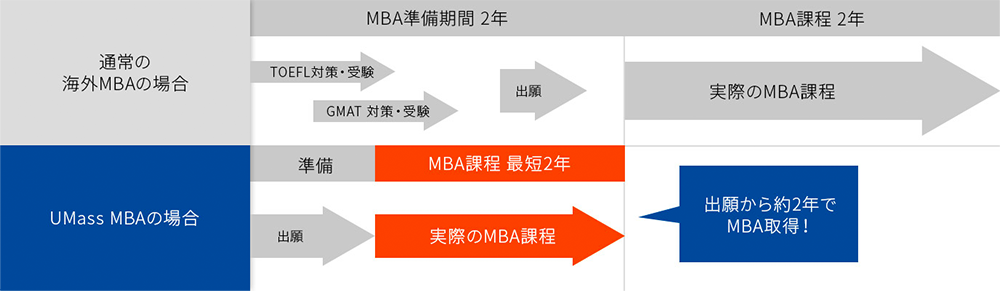 マサチューセッツ州立大学MBAプログラムでは、時間ロスの原因であるTOEFL・GMATを入学条件に求めず、日本でなじみのある「TOEIC」の700点を英語条件としました。これにより、TOEFLやGMATの準備期間なく、すぐに米国MBAのカリキュラムをスタートできるのです。