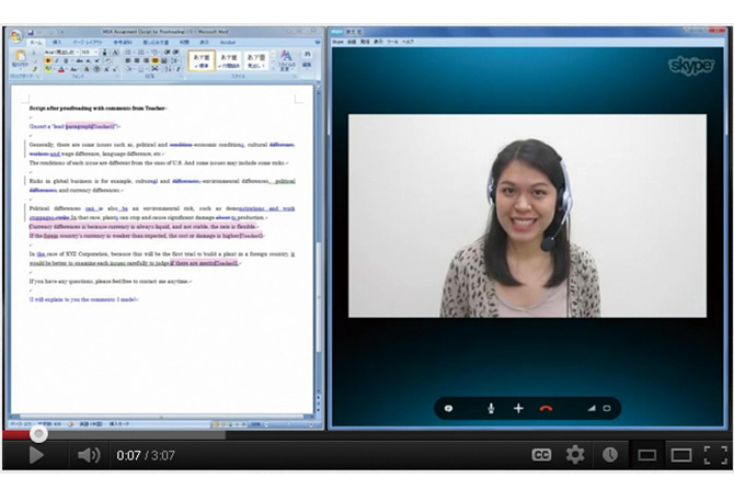 毎週のレポート課題は全て英文で作成しなくてはなりませんが、正しく書いたつもりでも、文法・言い回しなど不自然な文章になってしまう事があります。 UMass MBAプログラムでは、MBA課程で出題される英文の課題を、サポート講師が即日添削、即日返却します。翌日以降には、添削済み課題に対しての講評レッスンをSkypeで受講可能。 課題・学習をマンツーマンで講師と共有することにより、英作文に不安がある方でも、安心してレベルアップが図れます。