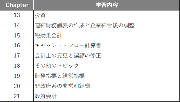 財務会計の後半では、企業結合や税効果会計といった前半よりやや専門的な論点を学習します。また、州・地方政府、非営利組織団体に適用される公会計についても学習します。