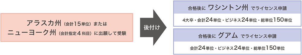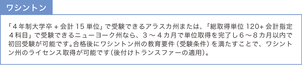 ワシントン州は他州合格者に対し、単位の後付けトランスファーを認めています。この制度を利用して、アラスカ州やニューヨーク州に出願し、合格後にワシントン州・グアムでライセンスを取得する方法を利用できます。
