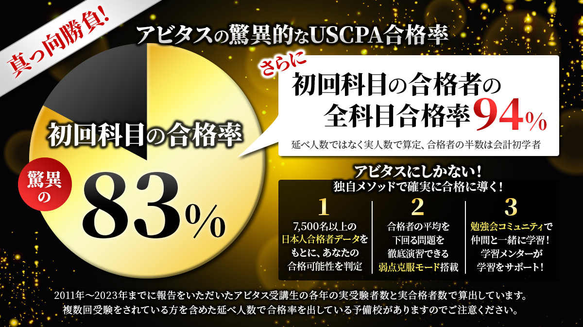 アビタスは「会計初学者」「英語に不安のある方」向けケアをはじめとする各種サービス、サポート体制が充実しています。USCPAで合格を勝ち取るなら断然「アビタス」がおススメです。